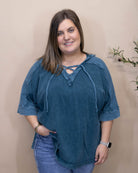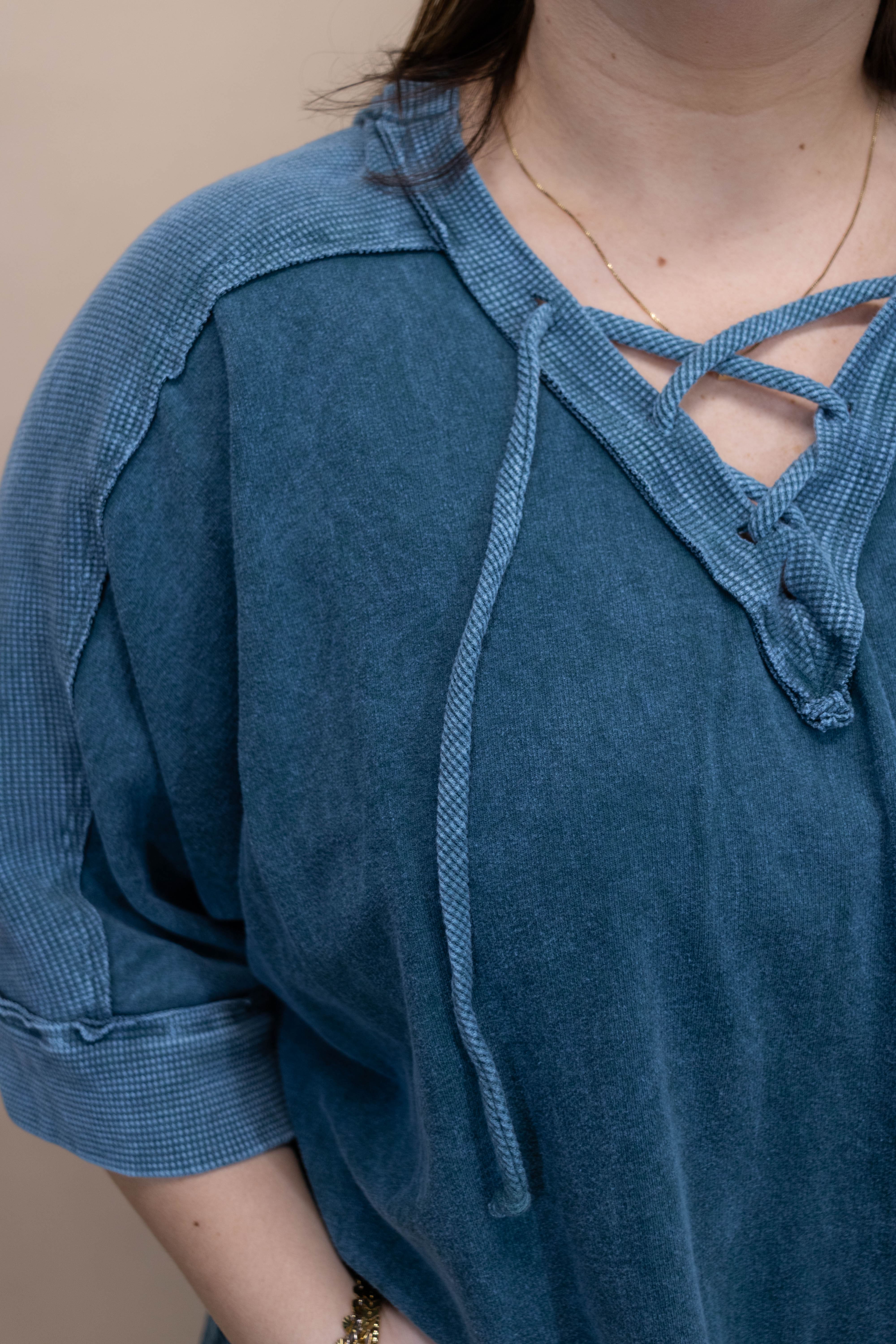 Step into style with the Along The Way Top, crafted in a stunning blue waffle knit that feels as good as it looks. Its unique lace-up V neckline adds a playful edge, making it the perfect piece to transition your wardrobe from summer to fall with ease and flair.