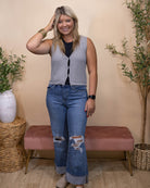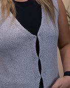 The Another Time Vest in light grey is a lightweight knitted layer designed for versatile styling. Featuring convenient clasps, you can choose to button it up for warmth or leave it open for a relaxed look. Perfect for adding subtle texture and comfort to any outfit.