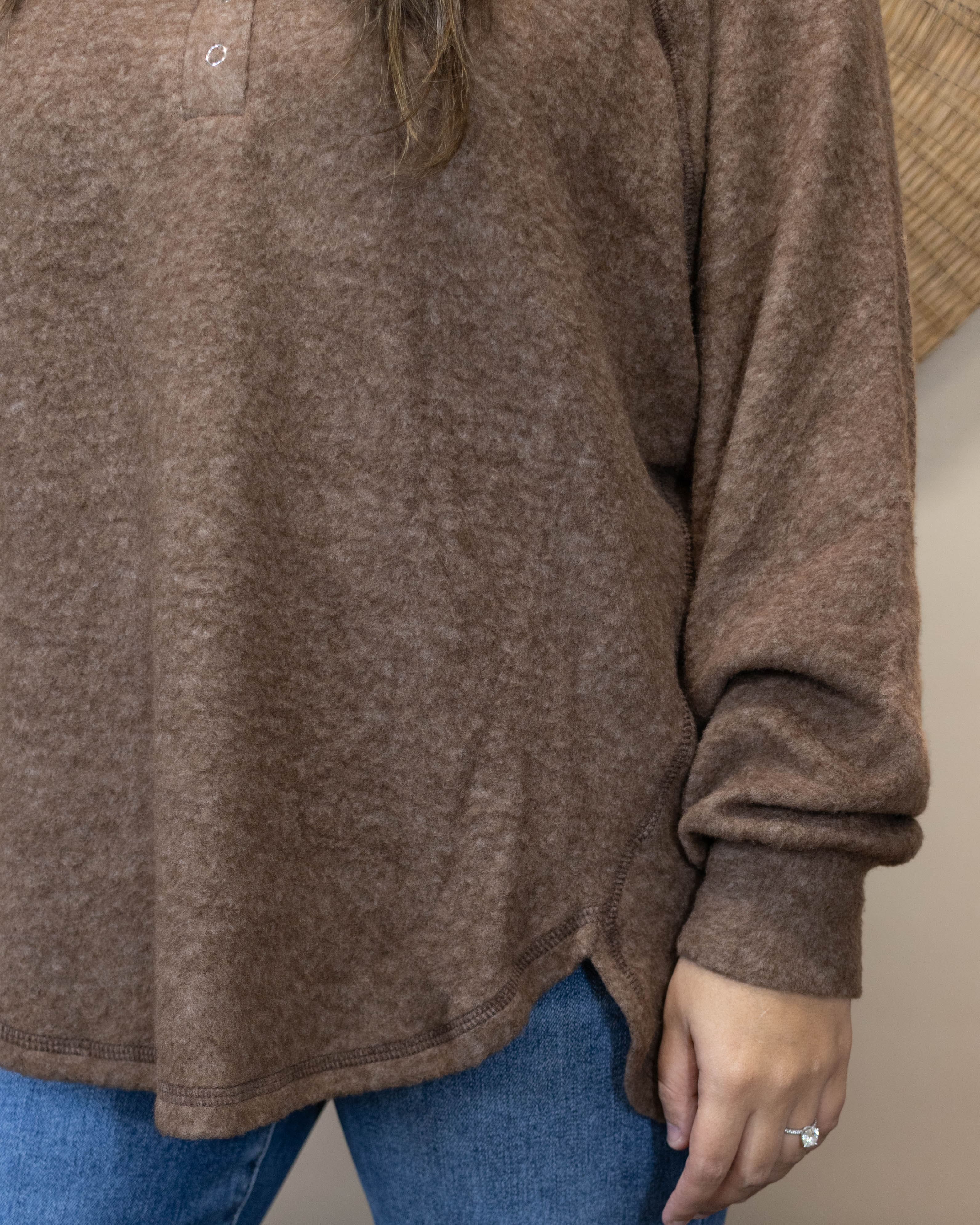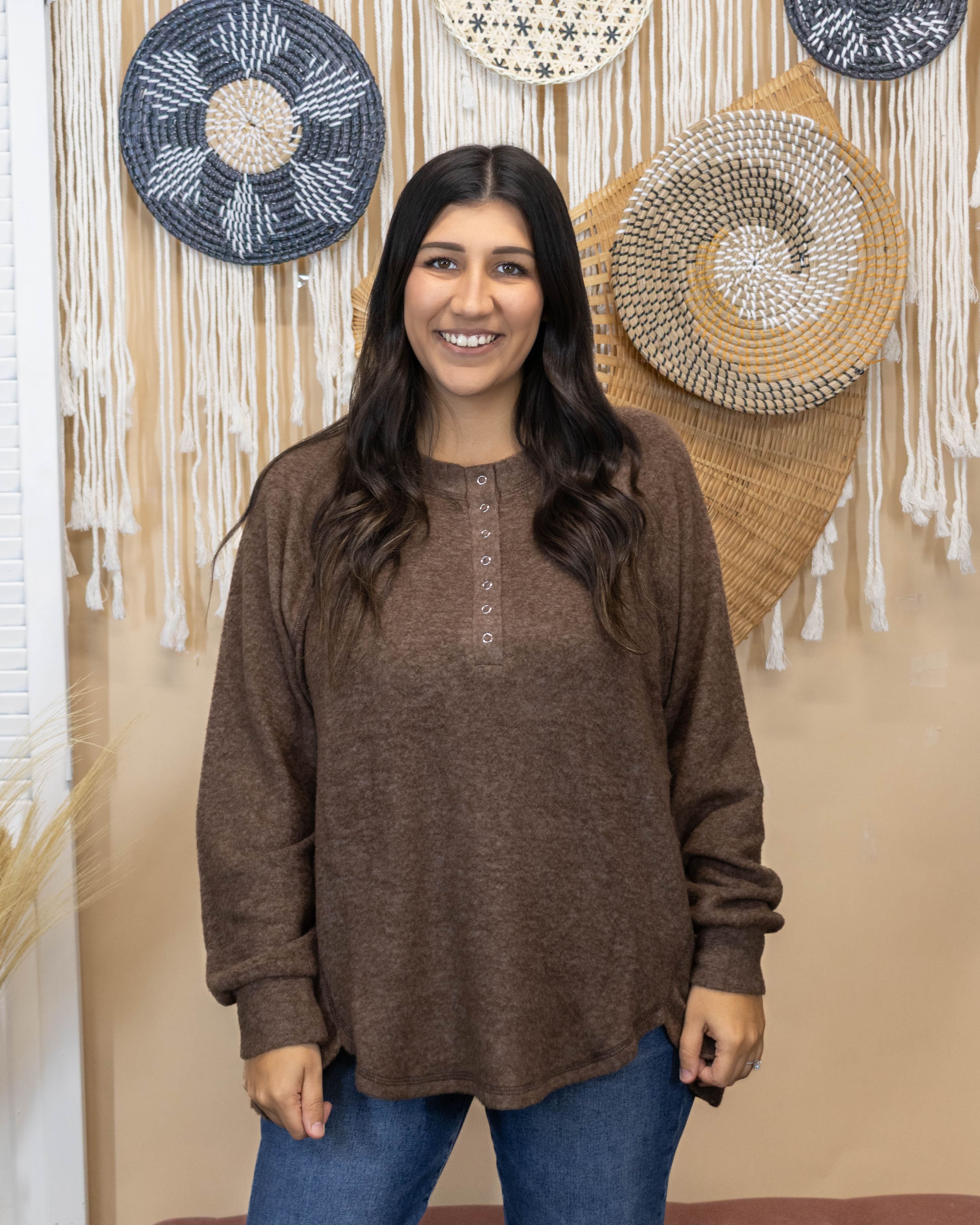Elevate your everyday wardrobe with this versatile brown long sleeve top. Soft, comfortable fabric drapes beautifully while the distinctive button detailing along the neckline adds a touch of refined style. Perfect for layering or wearing solo, this piece transitions seamlessly from casual days to polished occasions. A timeless essential that works harder than it looks.