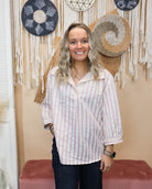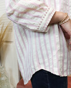 This baby pink striped button-up is ready to become your favorite go-to piece. The soft color palette and playful stripes strike the perfect balance between sweet and sophisticated. Button it all the way up for a polished look, or rock it half-buttoned over a fitted tank for casual vibes. Pair it with denim, linen pants, or a skirt—this top plays well with everything and makes getting dressed feel like a breeze.
