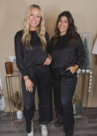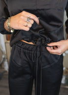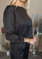 This Feminine Love Top is the perfect statement of style and comfort. Crafted in satin satin black, it features long sleeves with an elastic band, adjustable cinch at the waist, and eyelet button in the back. Perfectly tailored for all-day wear and style. It pairs perfectly with the Feminine Love Pant as well!