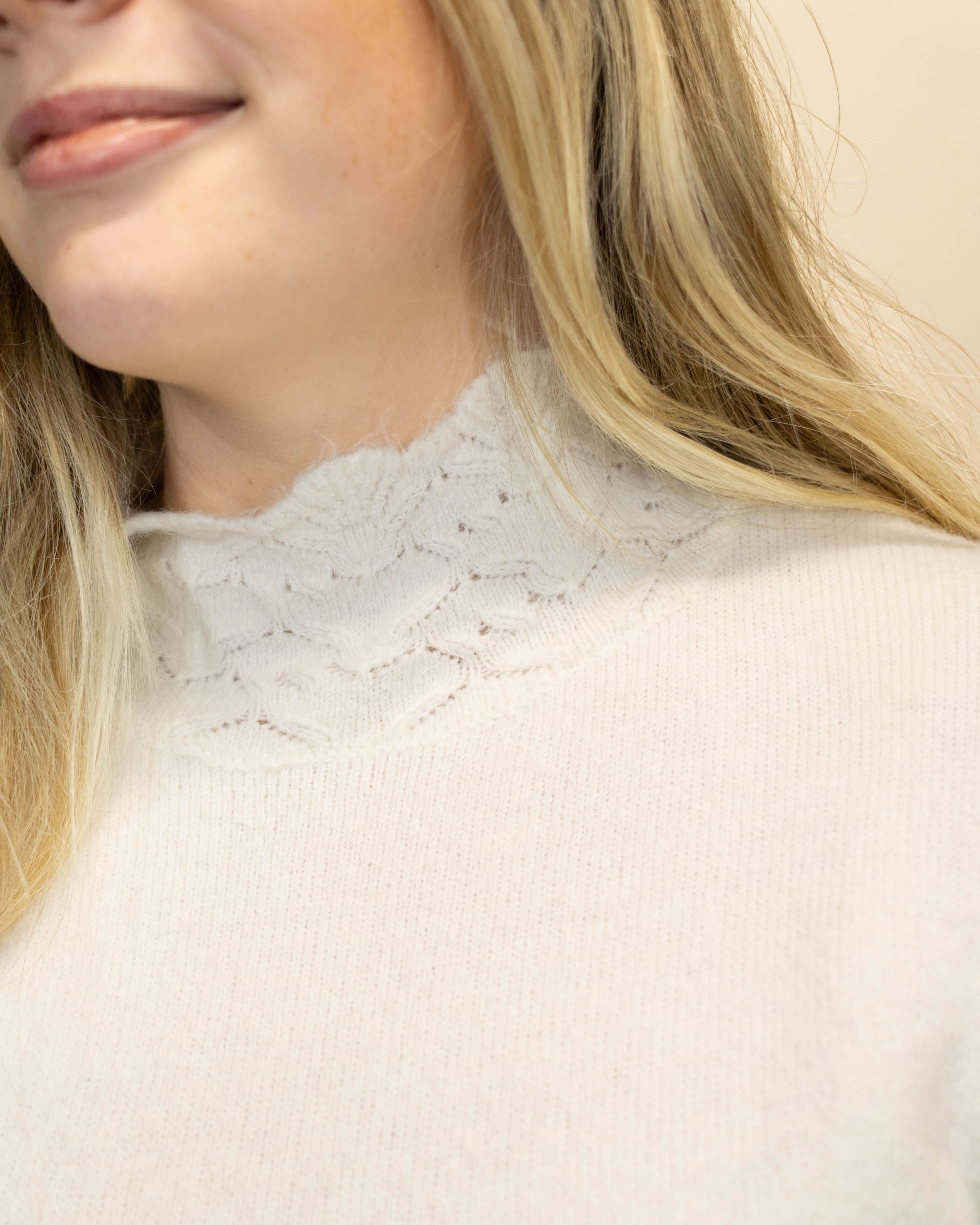 Stay effortlessly chic in the Find The Love Sweater, featuring a soft white knit with long sleeves and a stylish flare at the cuffs. The elegant white turtleneck adds warmth and sophistication, making it perfect for both cozy days and polished outings. This sweater combines comfort and trendiness to keep your wardrobe fresh and inviting.