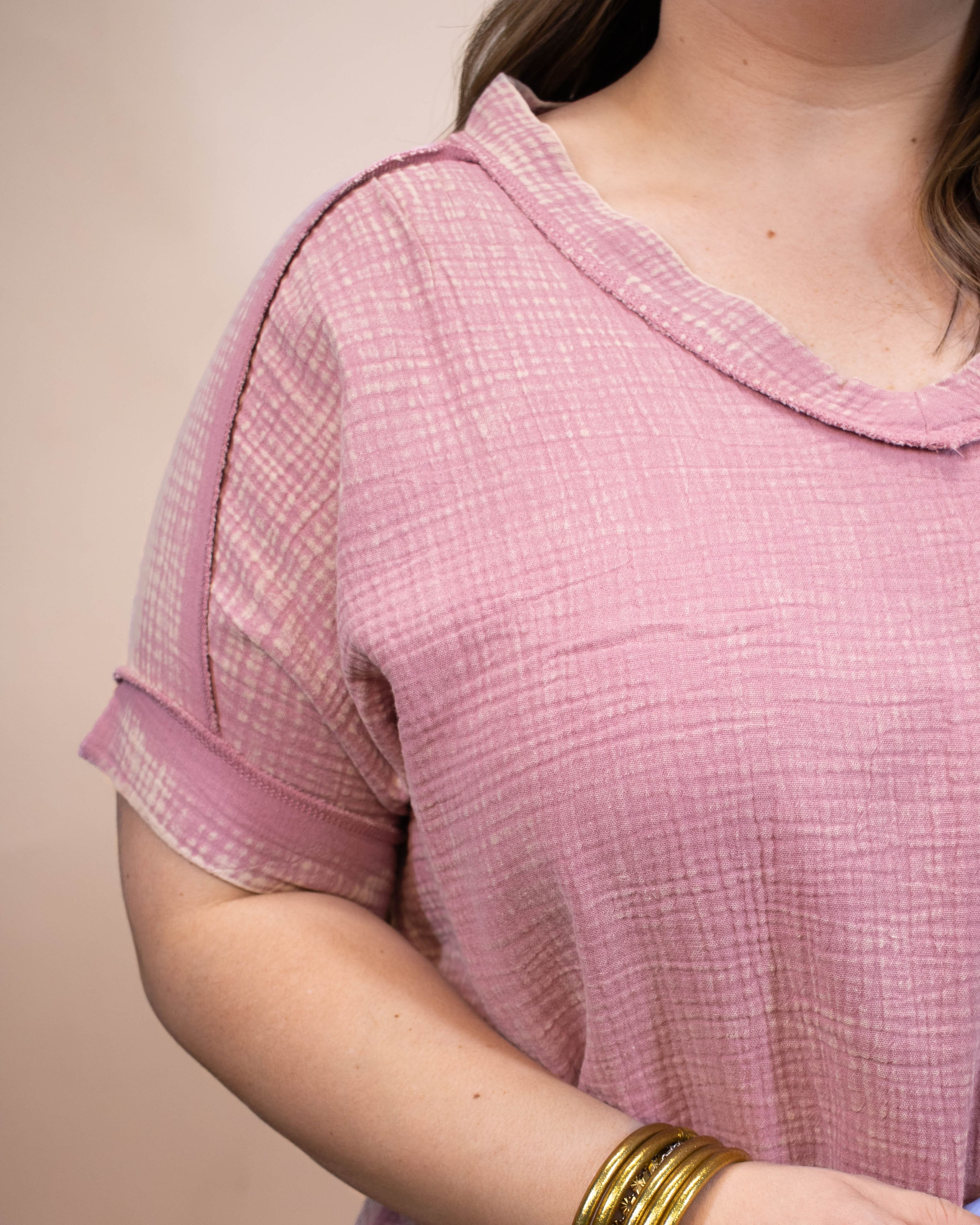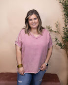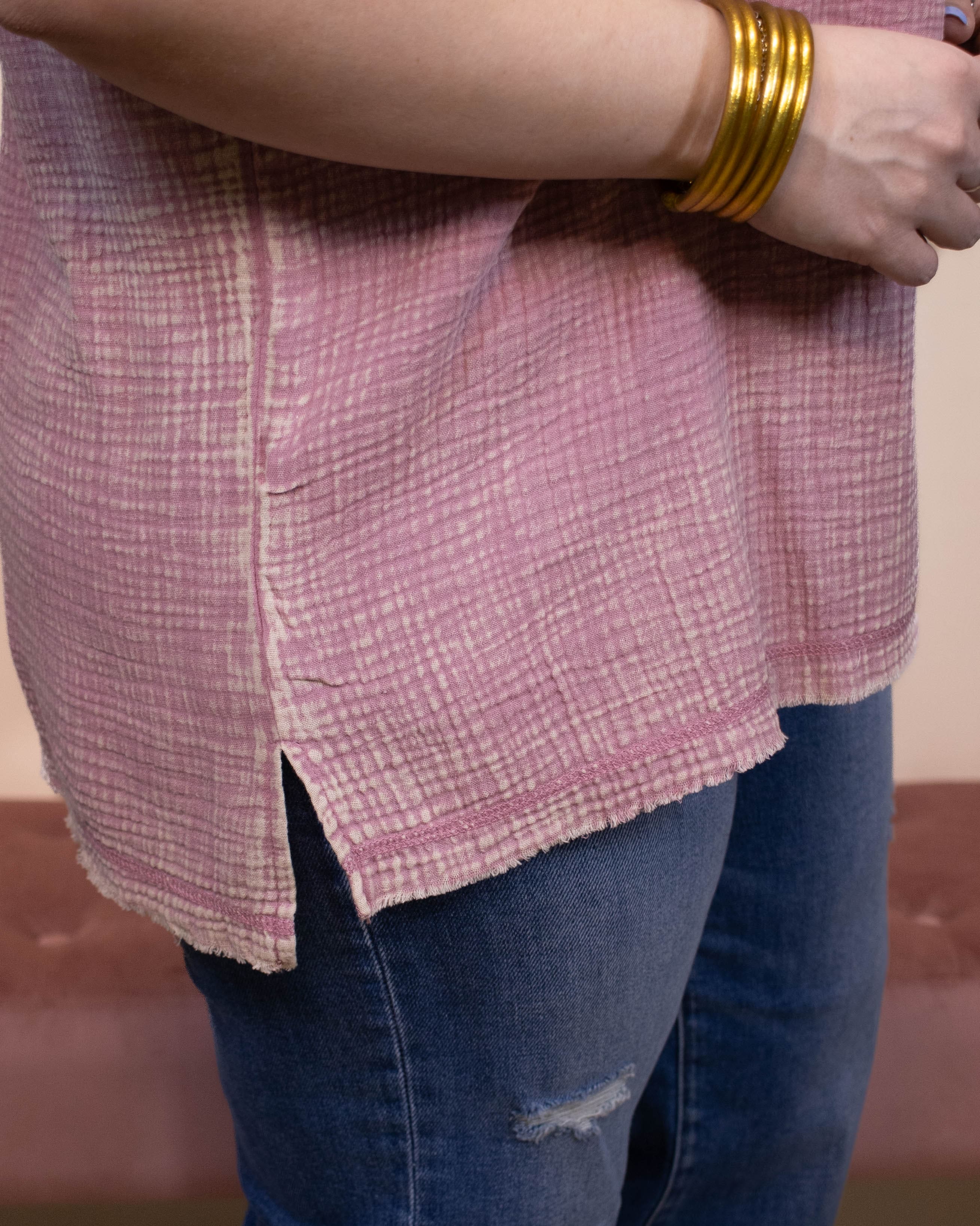 The How We Know Top in Lt. Rose features a soft pink mineral-washed linen fabric that offers breathable comfort and a relaxed vibe. Raw hemlines and a small side slit add subtle, stylish details, making this top a perfect blend of effortless elegance and casual charm.