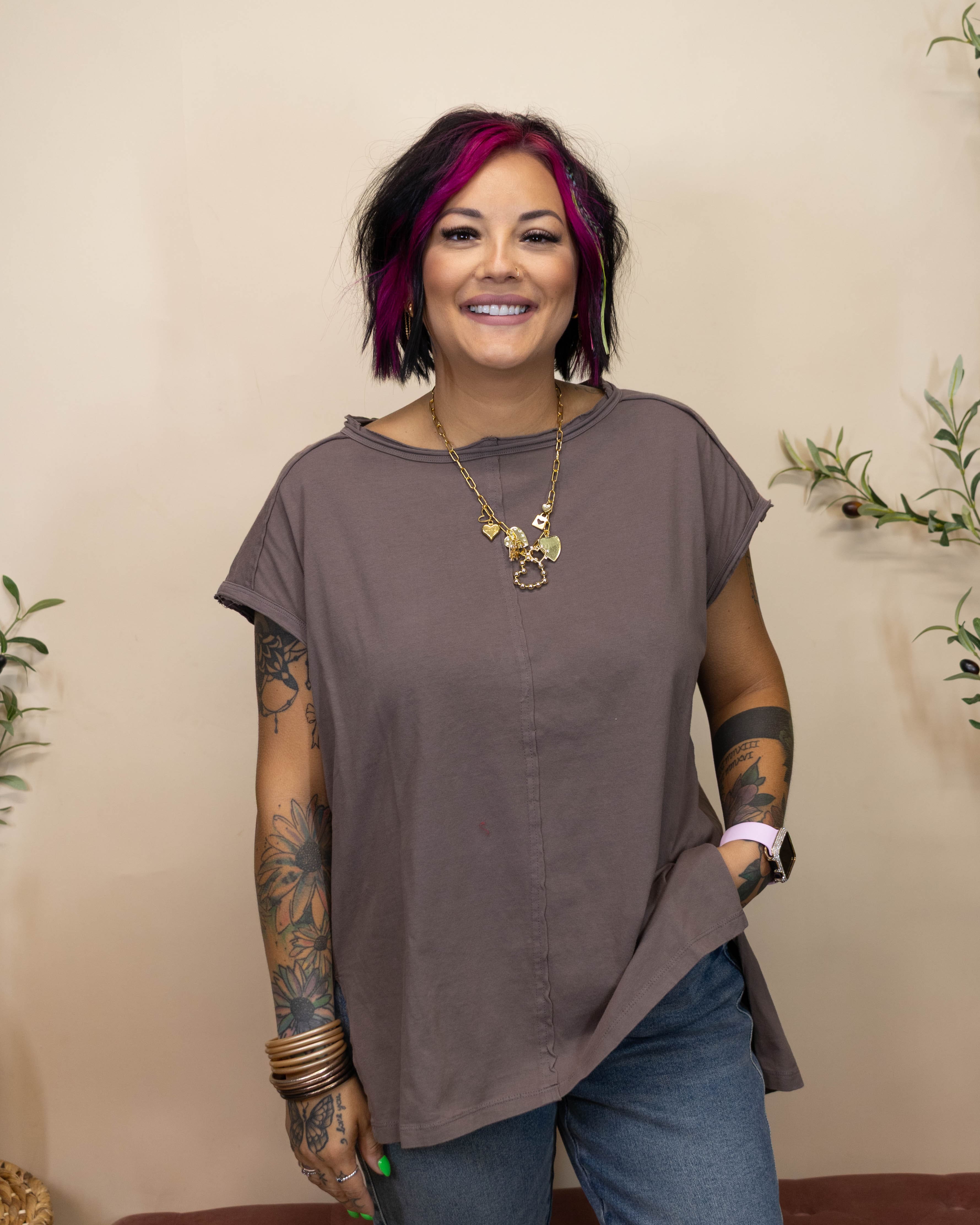 The In For More Top is a versatile layering essential featuring raw hemlines and capped sleeves for a modern edge. Its lightweight fabric ensures comfort throughout the day, while the slightly longer back adds a flattering silhouette. Perfect for mixing and matching, this top effortlessly enhances any wardrobe.\