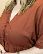 Elevate your wardrobe with the Keep It Together Top, featuring a flattering V-neck and comfortable three-quarter sleeves. Its charming burnt orange hue adds a warm, stylish pop of color perfect for any casual or dressy occasion. Designed to keep you looking effortlessly polished all day long.