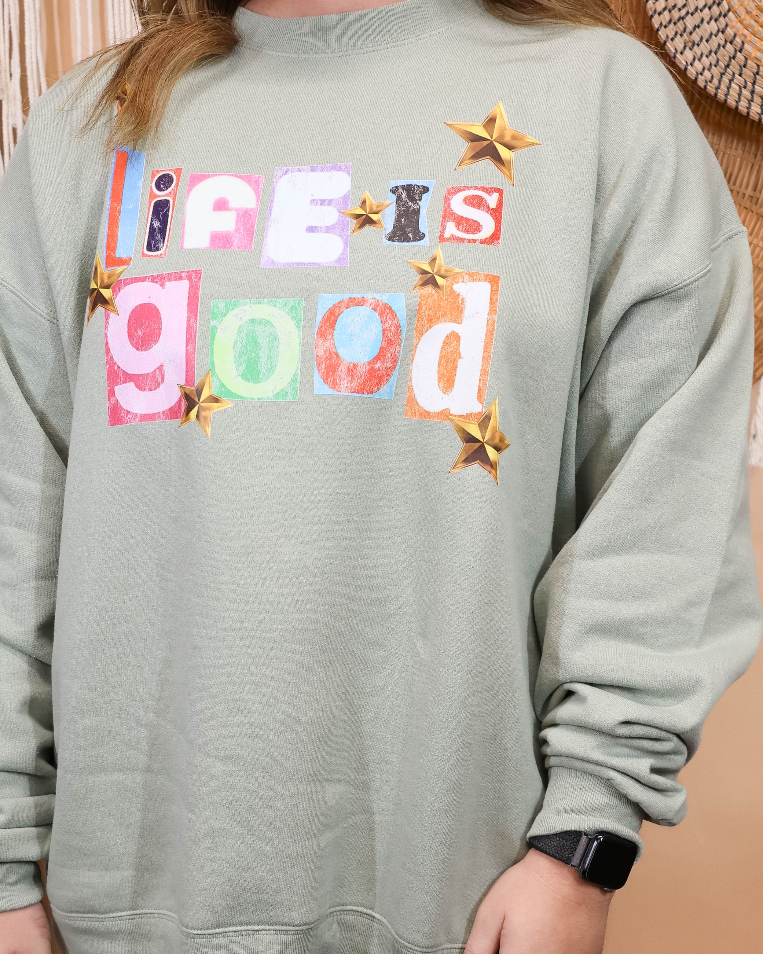 Stay cozy and stylish in this green Life Is Good Graphic Sweatshirt. Designed for comfort, its soft fabric makes it perfect for casual days while adding a cute, laid-back vibe to your wardrobe. Whether you’re lounging at home or heading out, this sweatshirt combines ease and charm effortlessly.