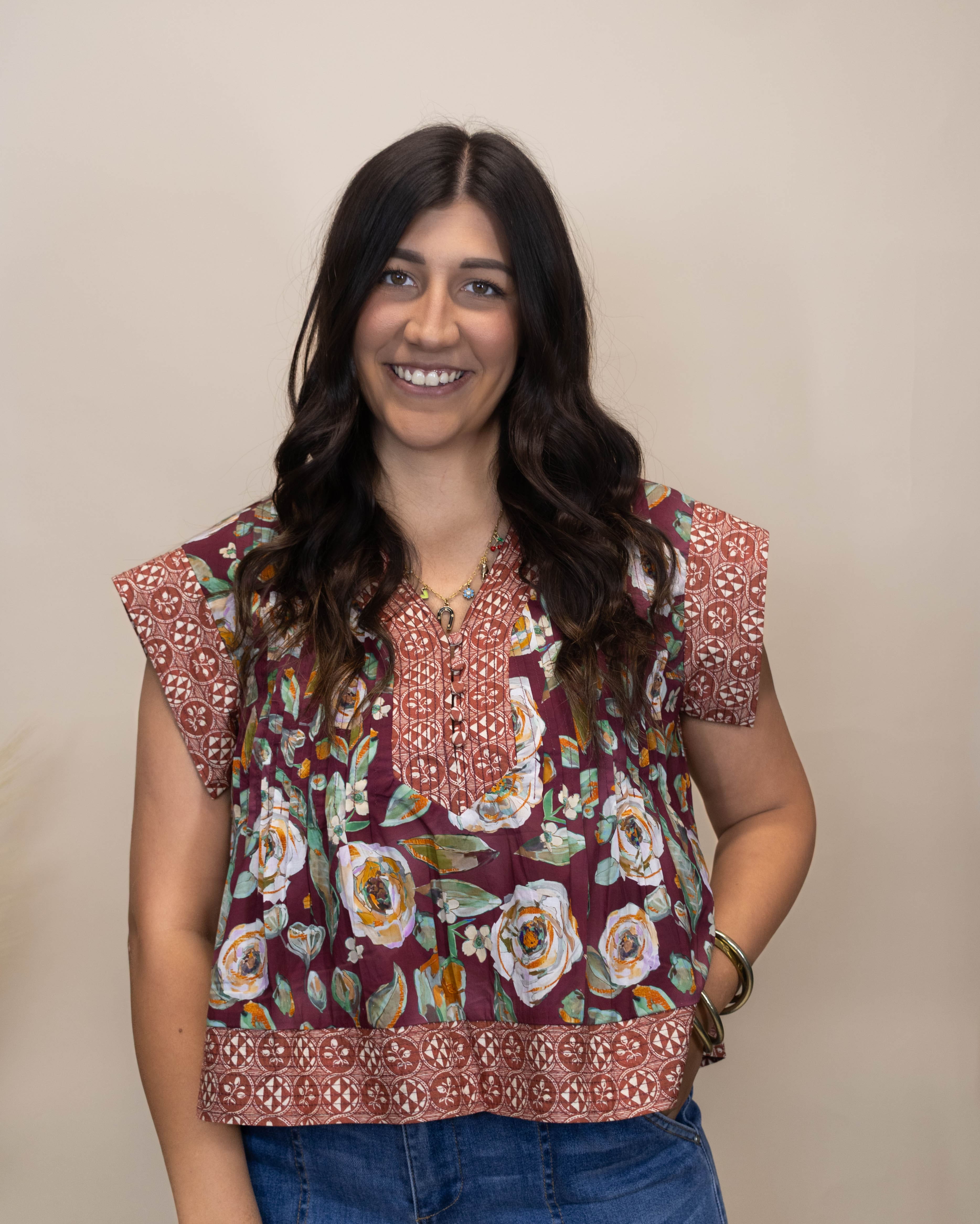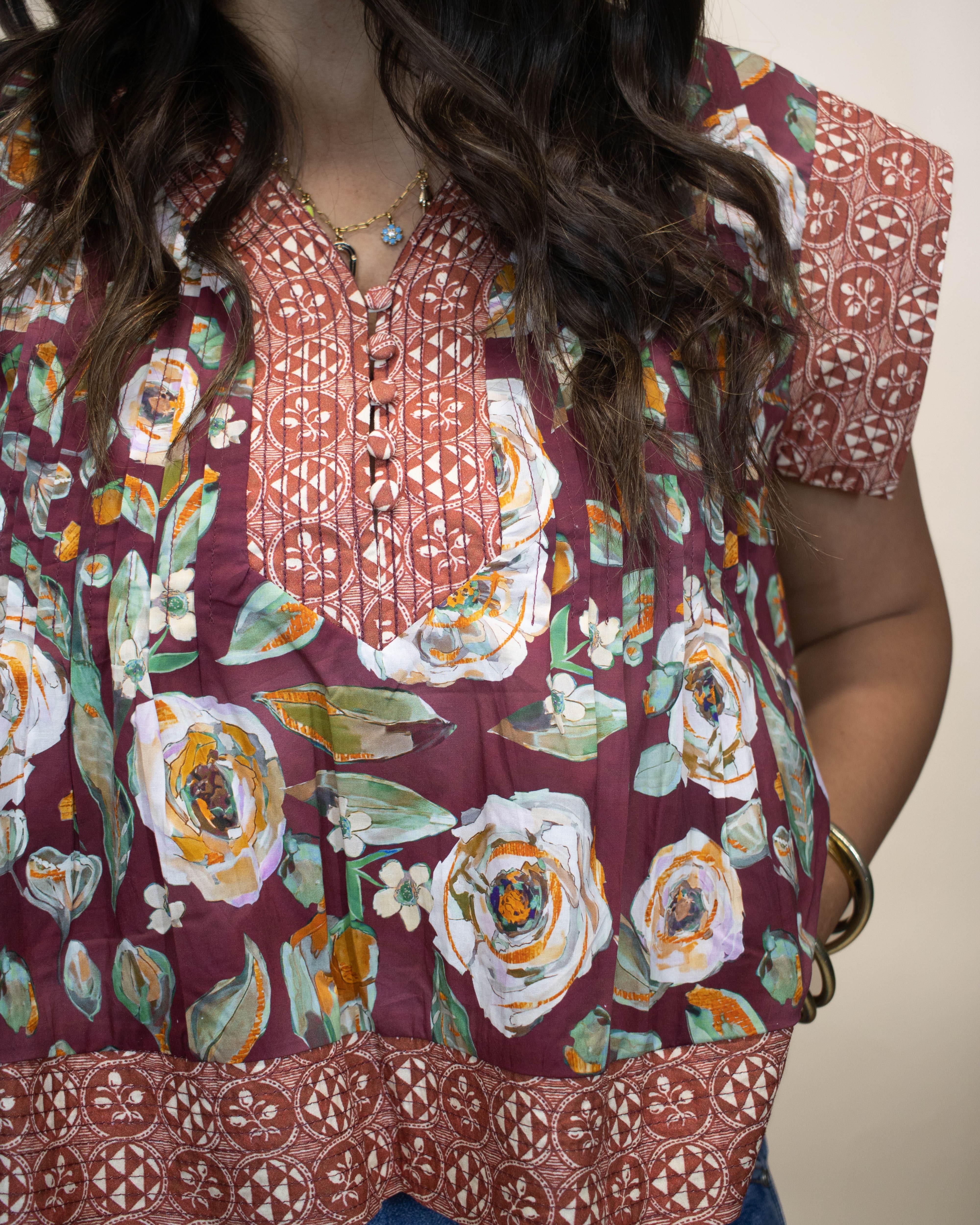The Never Too Much Top features a rich burgundy base adorned with delicate floral accents and a striking burnt orange patterned trim. Designed with a flattering V-neckline, buttons, and a slightly cropped fit, this top effortlessly blends bold colors and feminine details for a standout look. Perfect for adding warmth and style to any outfit.