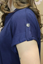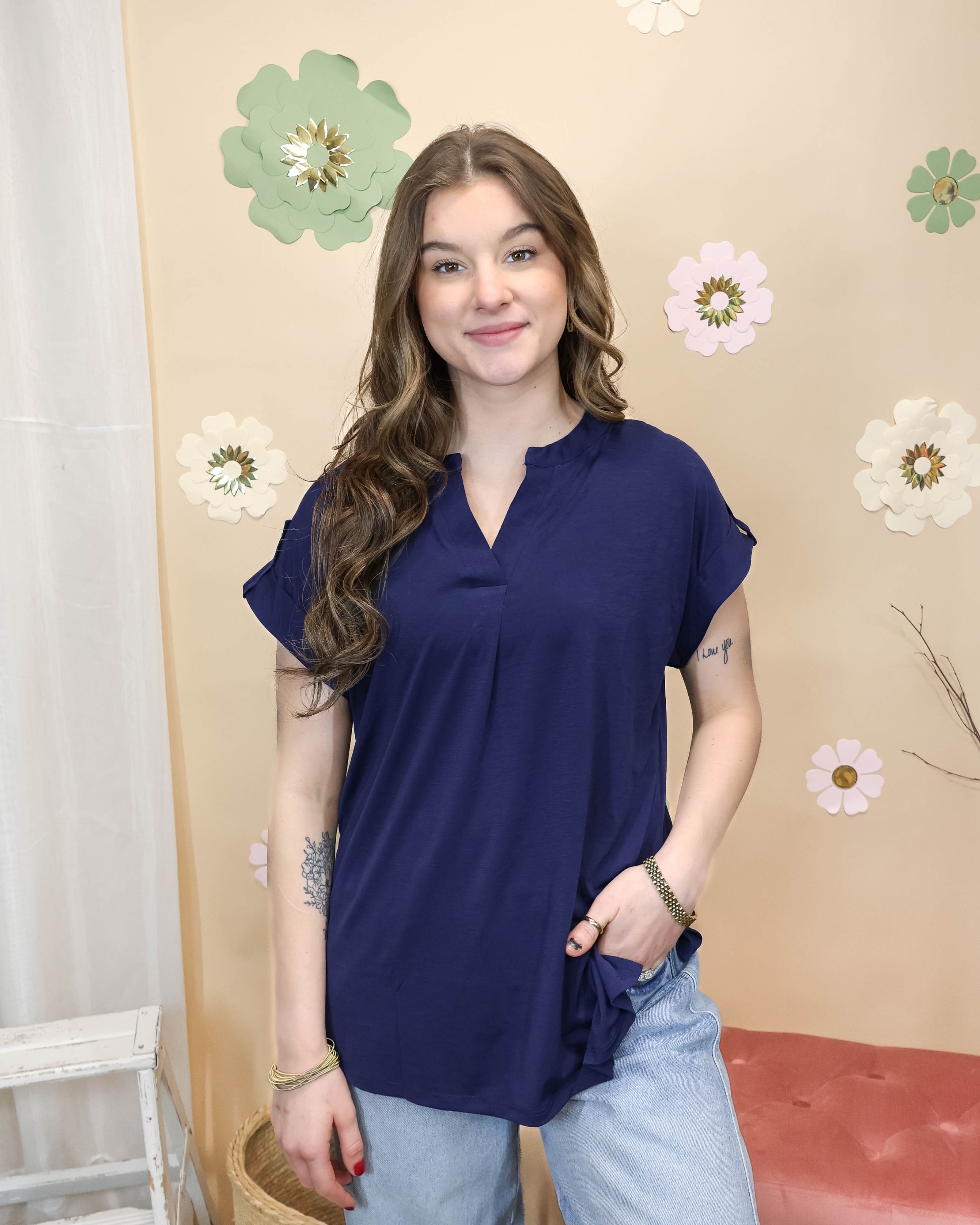 This navy top is giving main character energy with its charming sleeve buttons and flattering V-neckline. Dress it down with your go-to jeans and sneakers for effortless casual vibes, or elevate it with a blazer and heels when you're ready to turn heads. The thoughtful button details on the sleeves add just enough personality to make this top feel special, whether you're keeping it low-key or going full glam. One top, endless ways to make it yours.