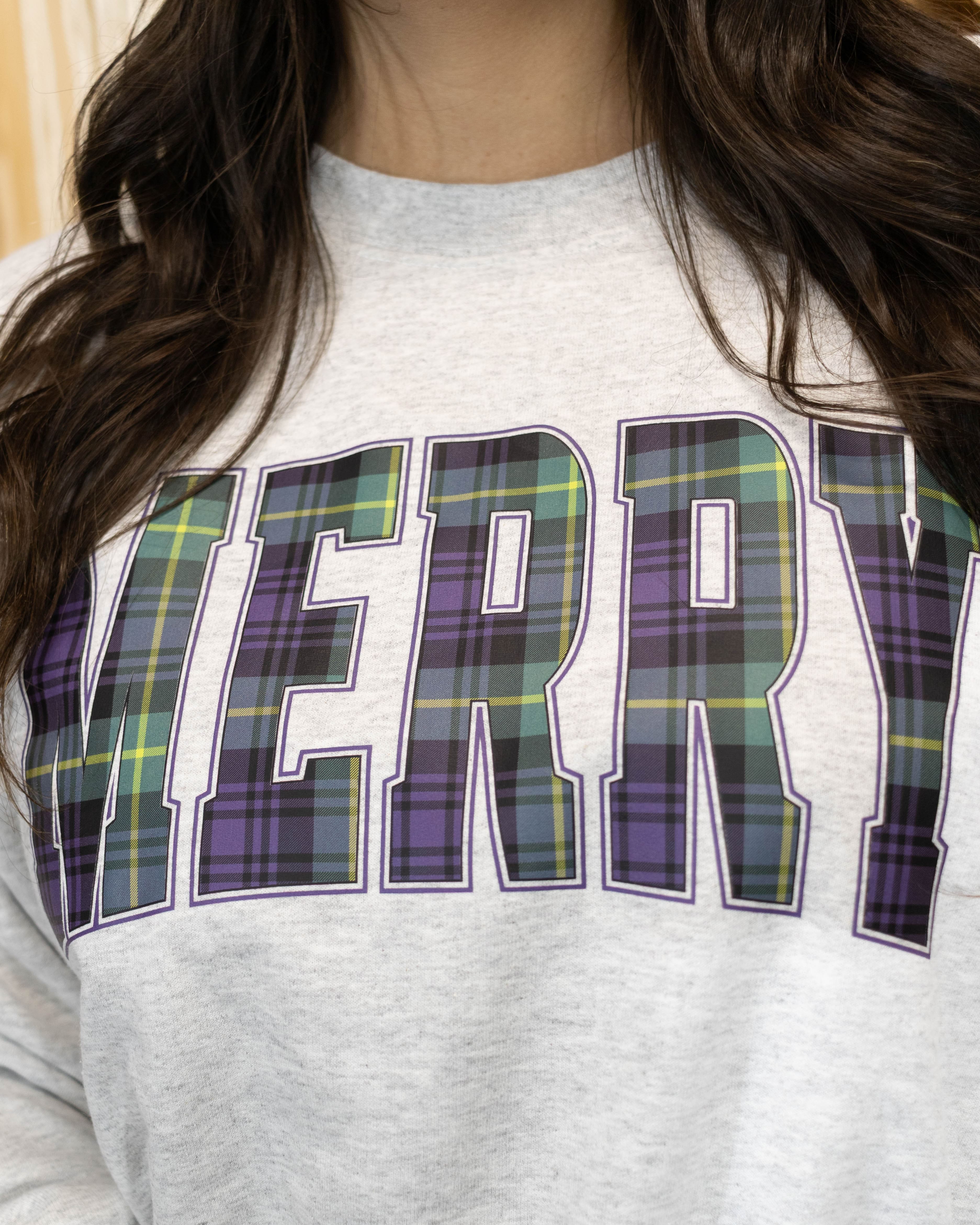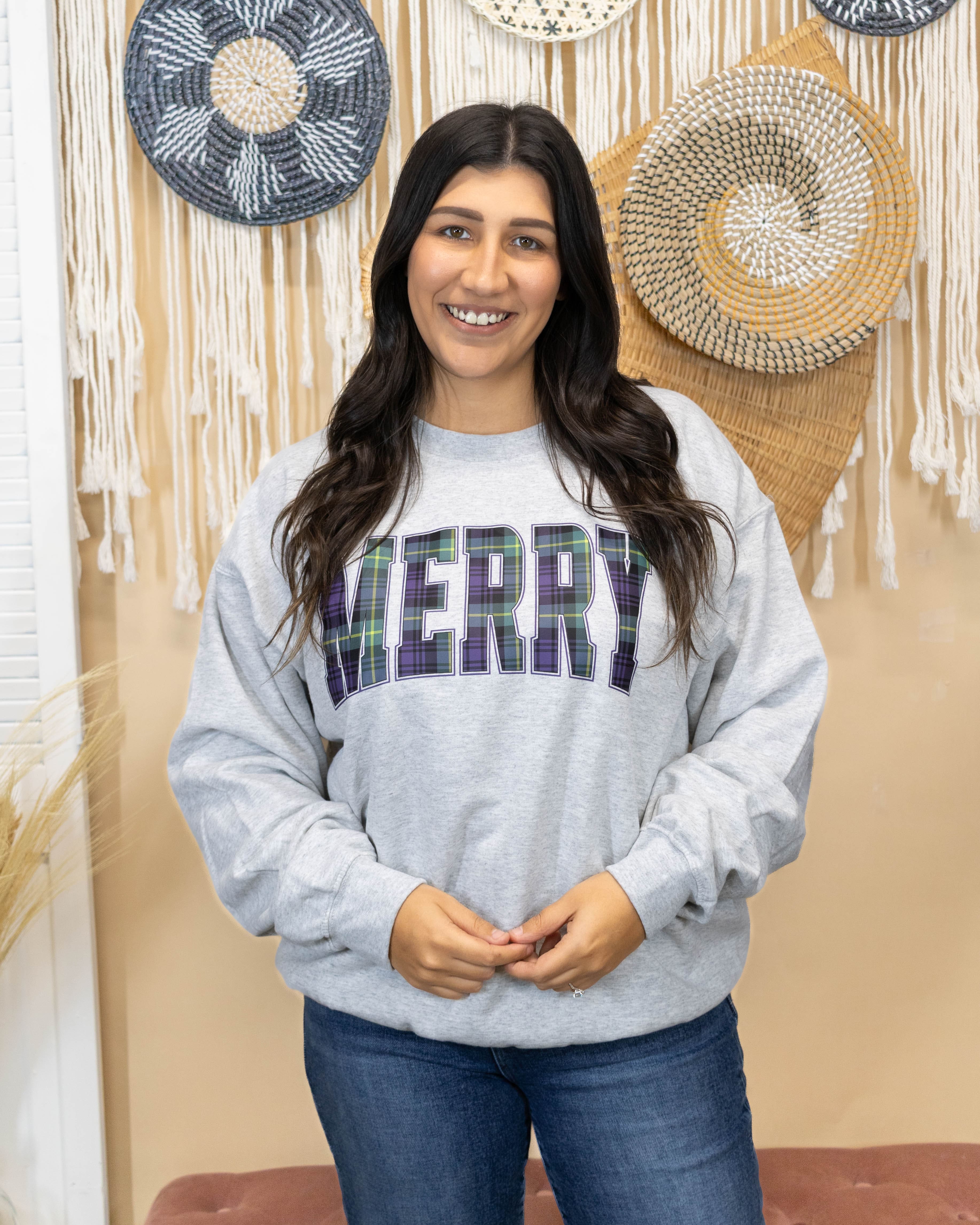 Wrap yourself in cozy comfort with this plaid merry graphic sweatshirt—the perfect blend of festive charm and everyday style. Featuring bold "merry" lettering set against a classic plaid pattern, it's an effortless way to spread seasonal cheer without sacrificing warmth or versatility. Whether you're heading out for holiday gatherings or settling in for quiet moments at home, this sweatshirt delivers the relaxed fit and soft fabric you'll want to reach for again and again.