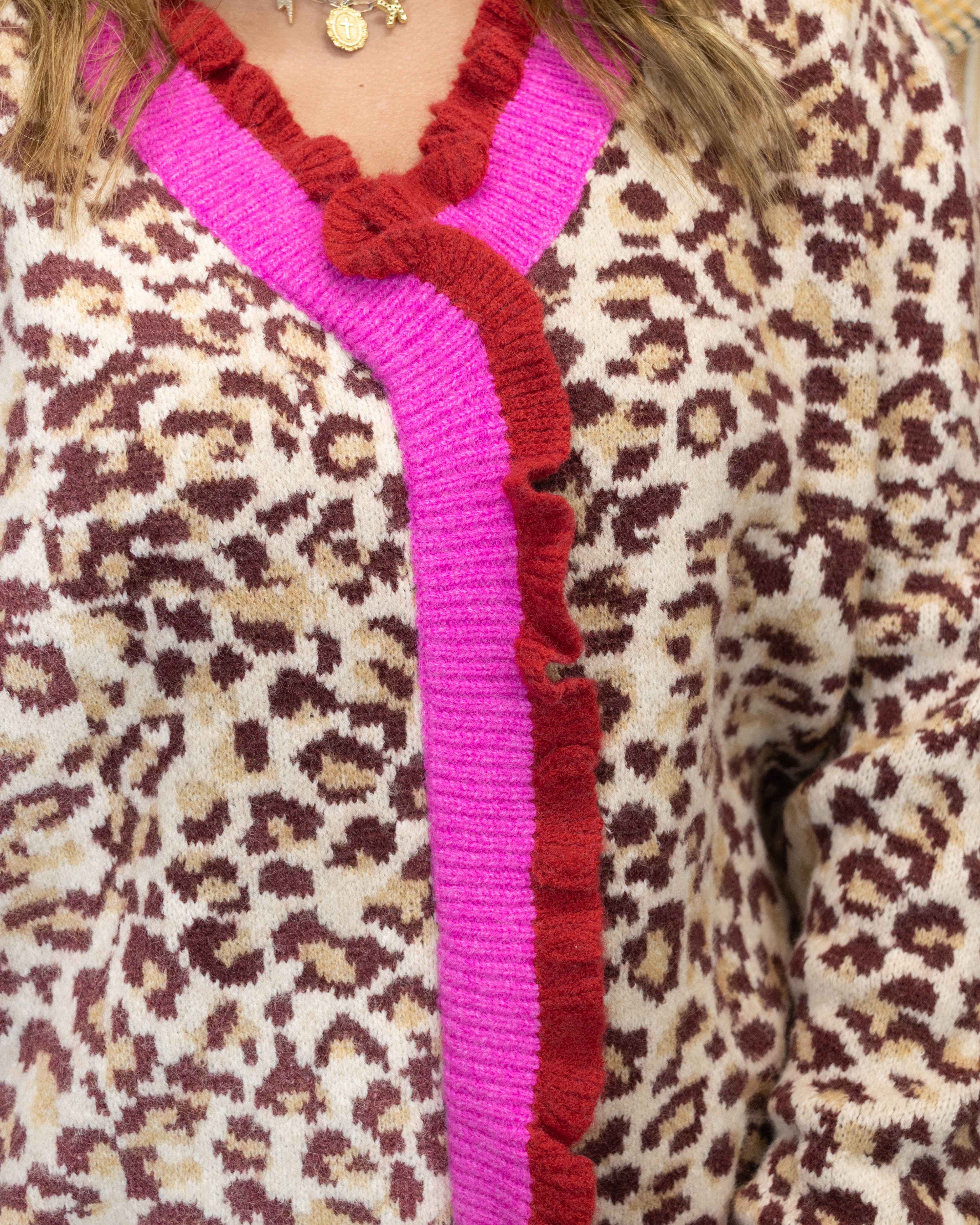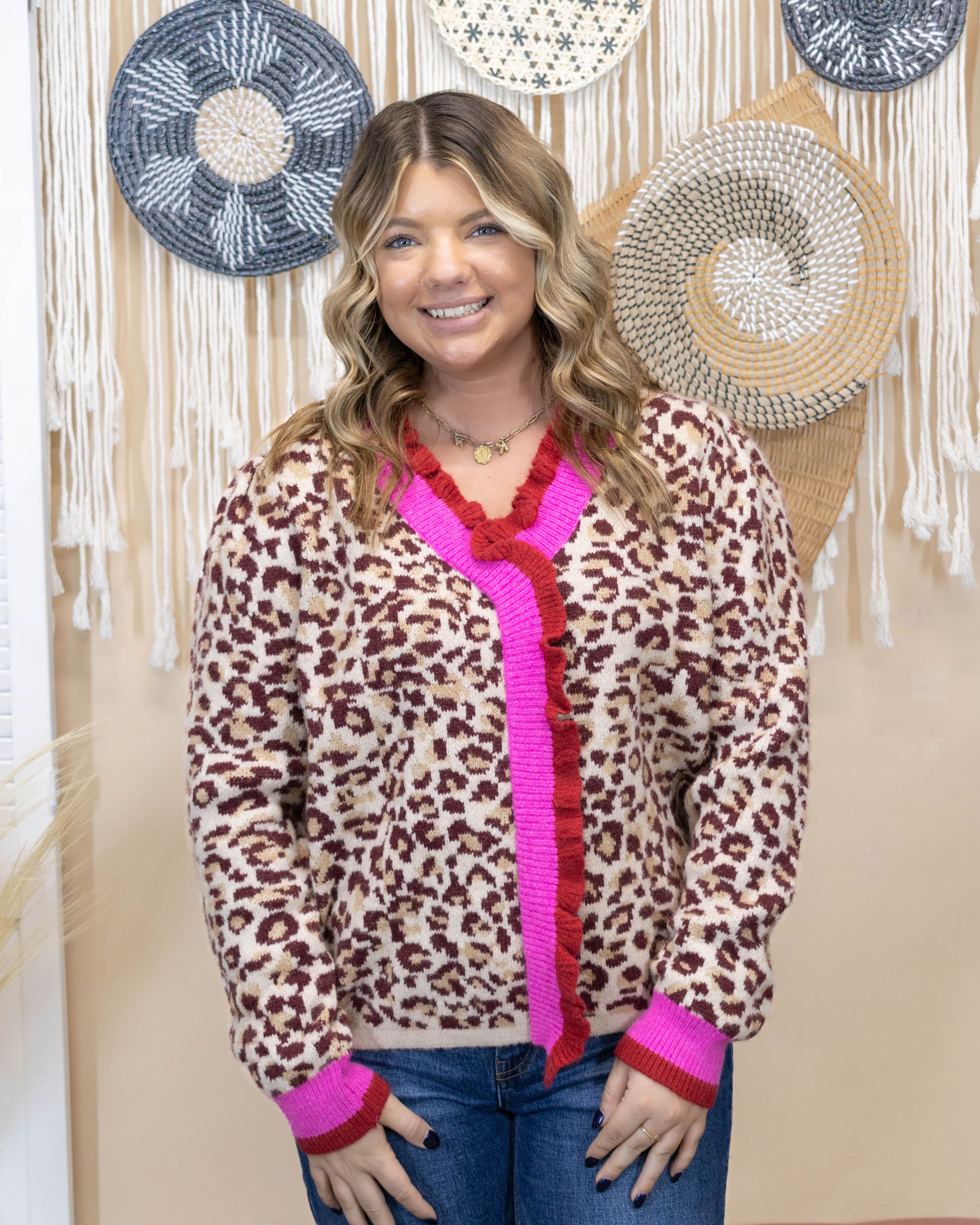 Elevate your everyday style with this striking leopard cardigan, designed to turn heads with its bold animal print and flattering V-neckline. The soft knit construction pairs perfectly with the unexpected pop of pink lining that peeks through, adding a playful contrast that keeps your look fresh and modern. Layer it over your favorite tee or dress it up for an instant style upgrade. Versatile, comfortable, and undeniably chic—this cardigan is the piece you'll reach for again and again.