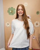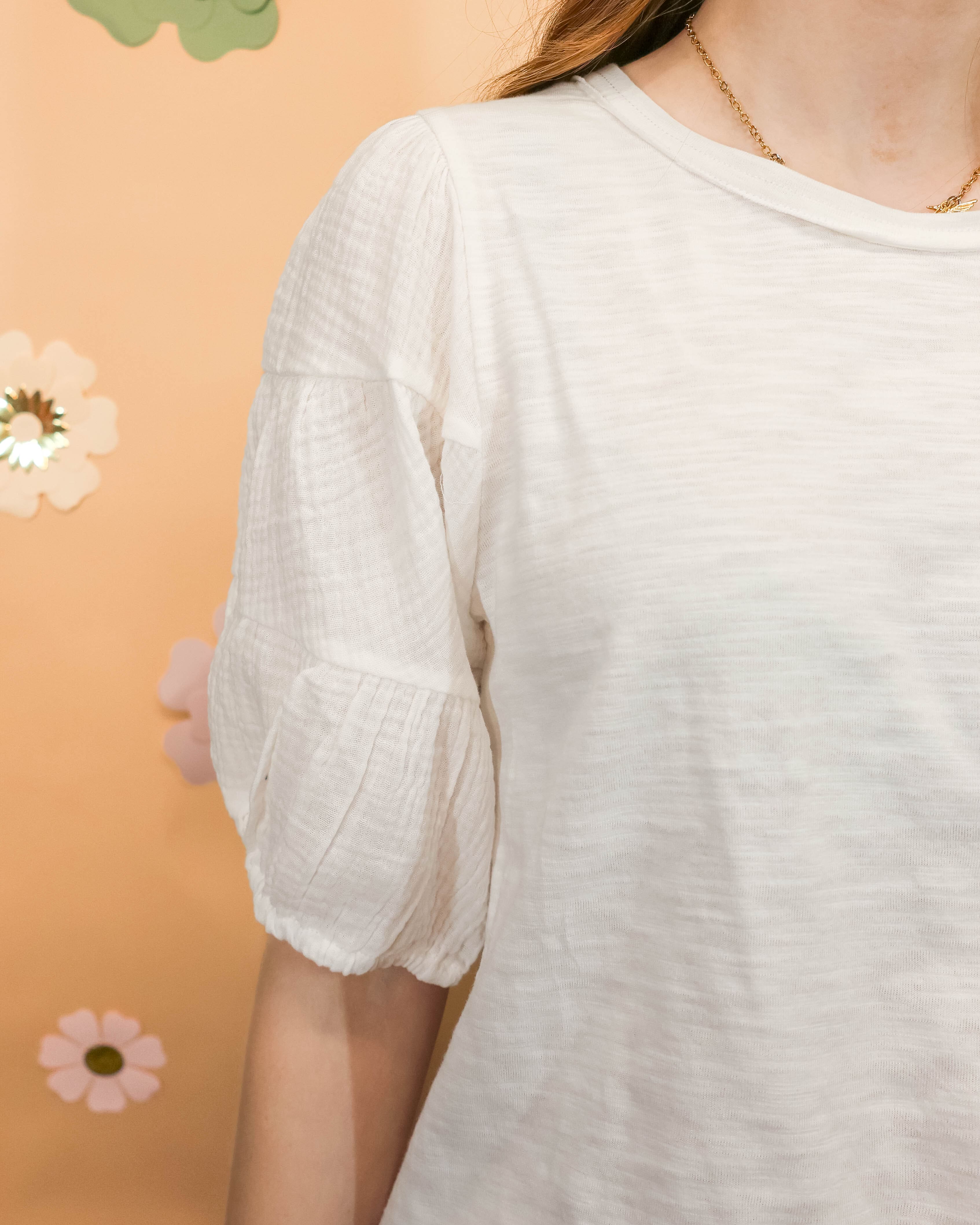 The Surrounded By Love Top is your wardrobe's new best friend. This versatile white essential features charming bubble sleeves with delicate gauze texture that adds just the right amount of whimsy. Dress it up with tailored trousers for a polished look or keep it casual with your favorite jeans—this piece plays well with everything. Simple, stylish, and endlessly adaptable, it's the kind of top you'll reach for again and again.
