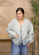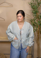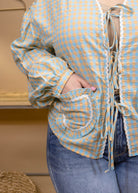 Experience the charm of our True Love Story Top. The light blue and orange gingham pattern exudes a playful yet romantic vibe, complemented by heart shaped pockets. The light weight material and cuffed sleeves add a casual touch, while the adjustable tie detailings offer a flattering fit. Love at first wear!