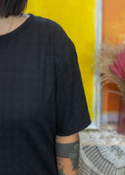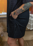 The Take What's Yours Dress is a versatile and stylish dress made of textured black material. It features a subtle checkered print and convenient pockets, making it a practical and fashionable transition piece for any occasion. Perfect for those who want to effortlessly elevate their wardrobe.