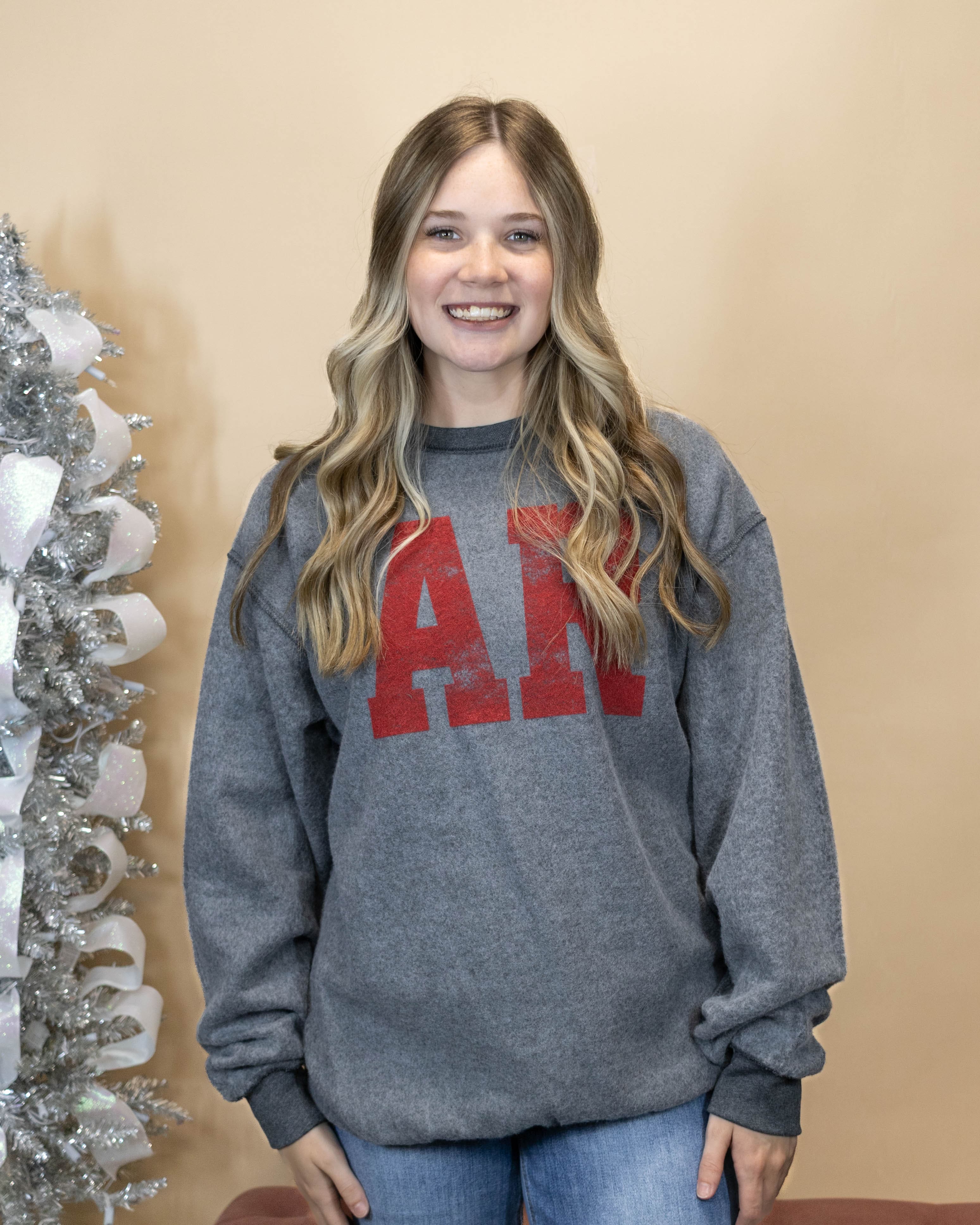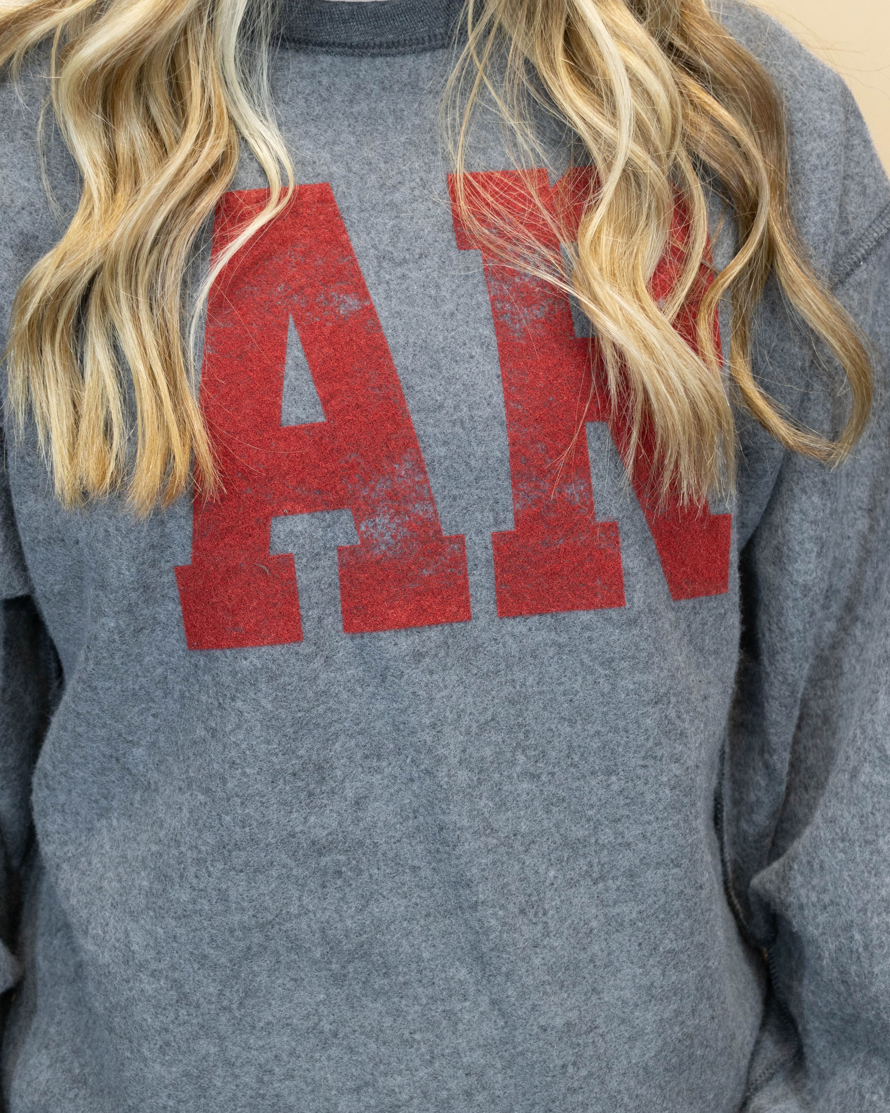 Embrace laid-back style with this Arkansas reversed graphic sweatshirt. Featuring bold red lettering against a soft grey base, it's the perfect blend of casual charm and comfort. Whether you're running errands or relaxing at home, this versatile piece delivers effortless appeal with a playful twist. Cozy enough for everyday wear, striking enough to make a statement.