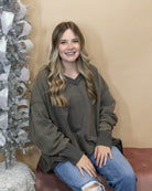 Slip into effortless style with this adorable sweatshirt featuring a flattering V-neckline and relaxed, oversized sleeves. Perfect for lounging, running errands, or casual hangouts, this cozy piece delivers comfort without compromising on charm. The soft ash tone pairs beautifully with everything in your wardrobe, making it an instant go-to favorite. Whether you're layering for cooler days or wearing solo, this sweatshirt wraps you in warmth and that undeniable cute factor you'll reach for again and again.