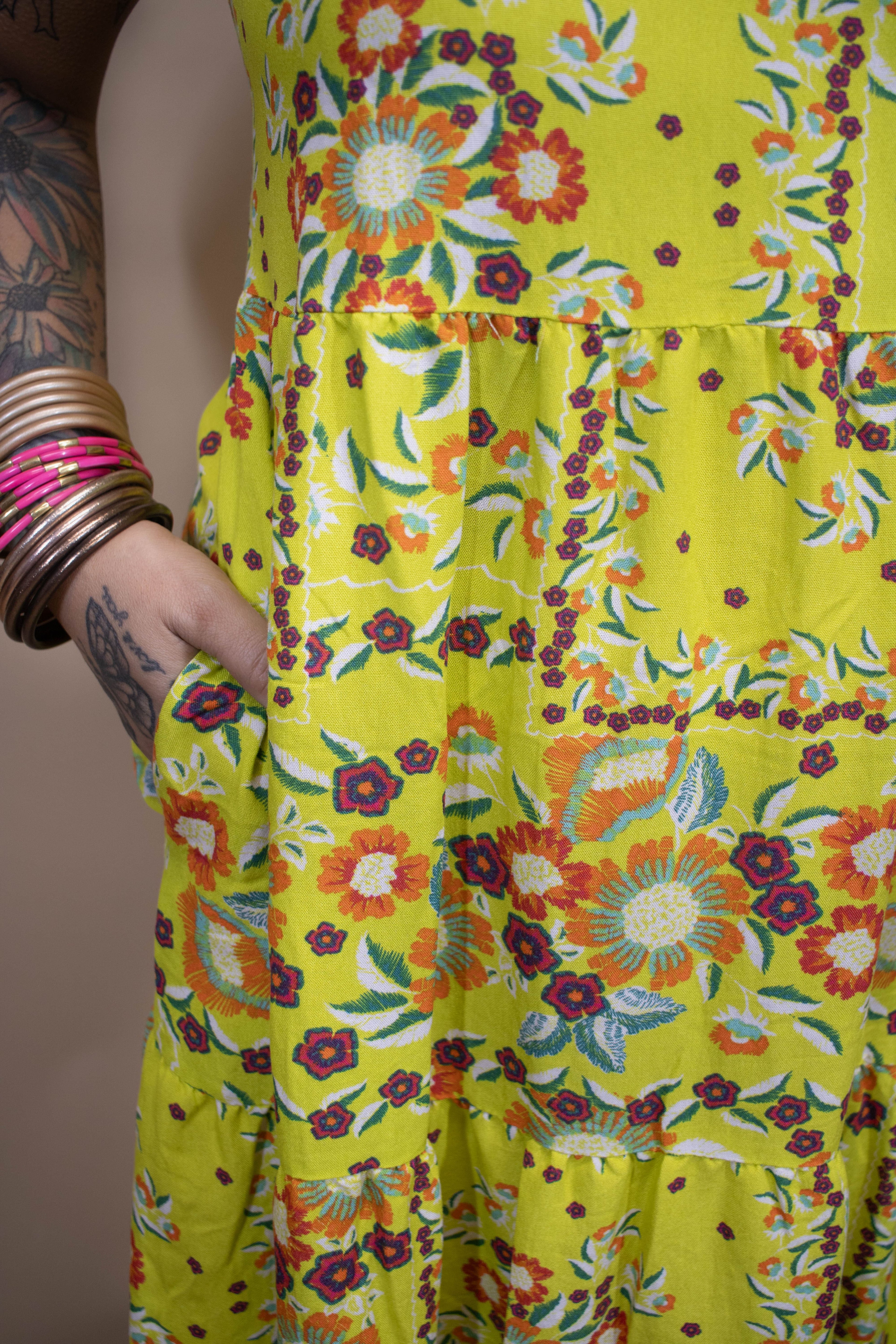 The Bright On By Midi Dress dazzles with a vibrant lime green background accented by pops of orange, dark greens, and fuchsia. Featuring adjustable tie straps for a perfect fit and convenient pockets, this maxi dress combines bold color with practical design for effortless style and comfort all day long.