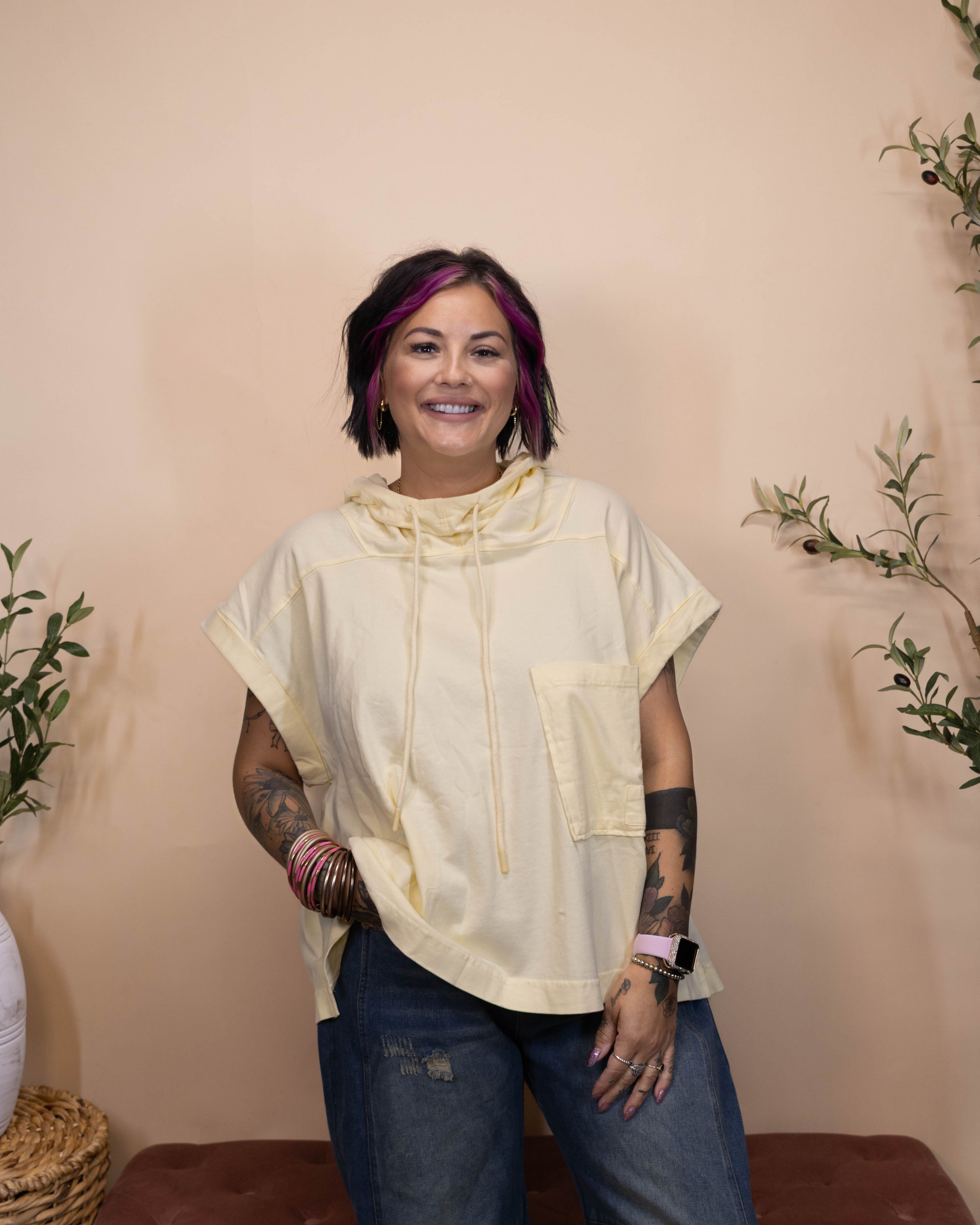 Brighten your casual wardrobe with the Here We Are Top, a sleeveless hoodie in a beautiful buttery yellow. Featuring a cozy cowl neckline with adjustable drawstrings and a large front pocket, this top combines comfort and style effortlessly, making it perfect for layering or wearing on its own.