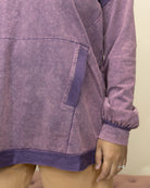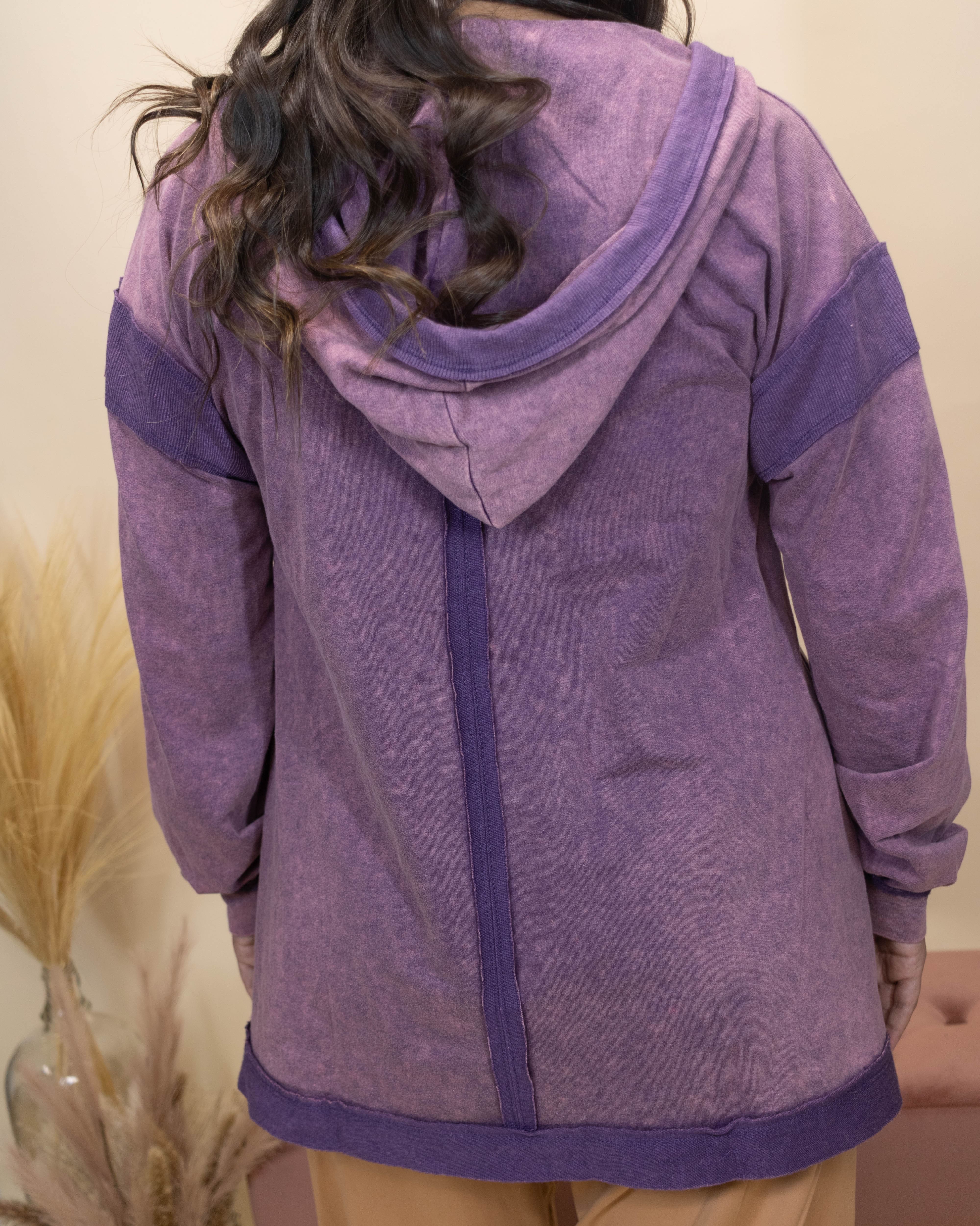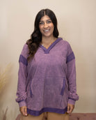 The Till We Go Top in eggplant offers a unique purple acid-washed look with darker purple accents along the hem lines for added depth. Featuring a V neckline and a hood with adjustable drawstrings, it combines style and functionality. Cuffed wristbands and a front pouch pocket complete this cozy, trendy hoodie perfect for everyday wear.