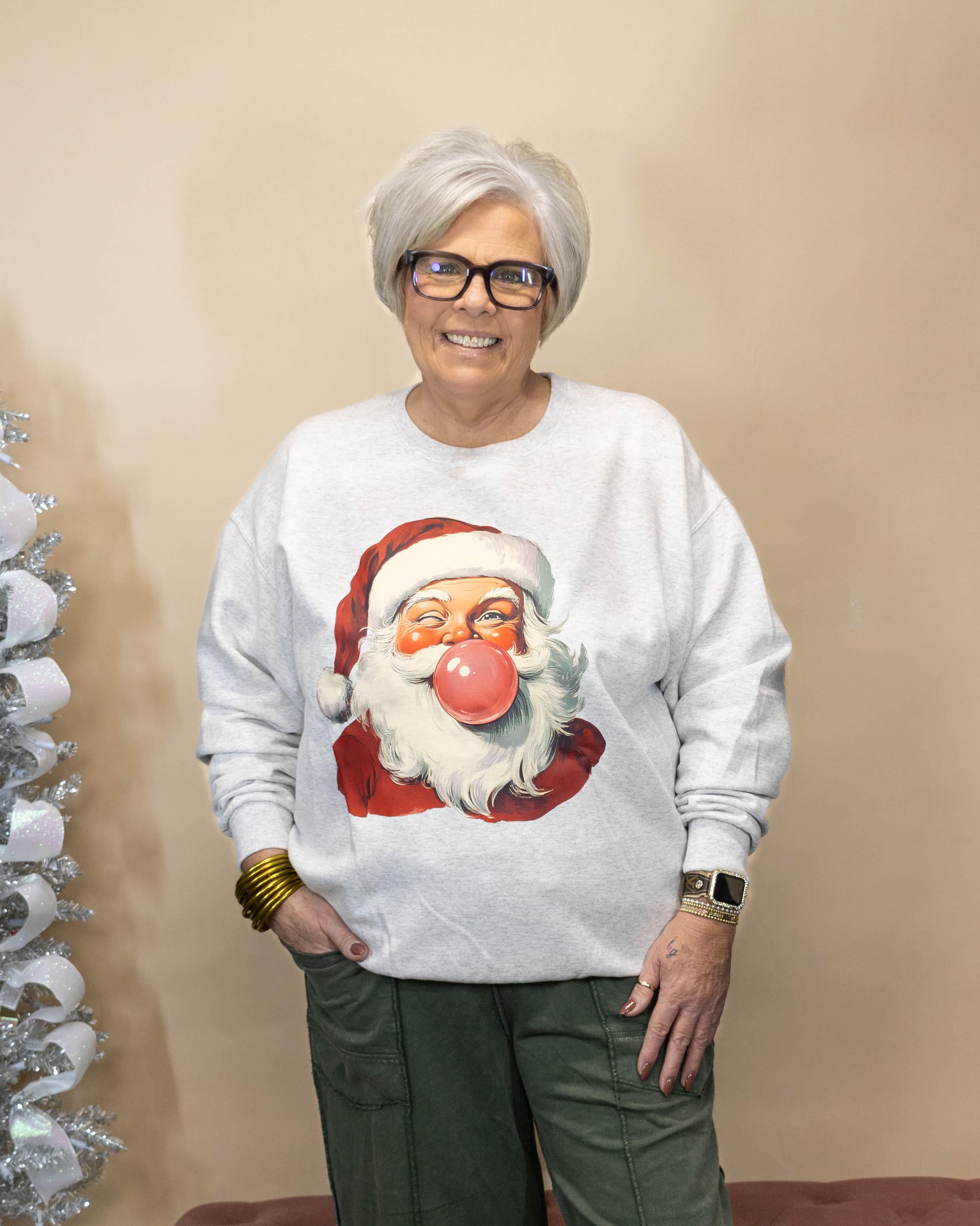 Celebrate the holiday spirit with this Vintage Santa Graphic Sweatshirt featuring a playful Santa blowing bubbles with chewing gum. Its charming, nostalgic design adds a fun twist to classic Christmas style while keeping you cozy and comfortable. Perfect for spreading joy and standing out at any festive gathering.
