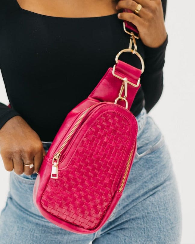 Meet our Waverly Woven Sling Bag. This must have is available in a beautiful magenta color, and its woven design is one you'll fall in love with. The Waverly includes an adjustable and removable strap, gold hardware, a compartment with a lock closure in addition to its zipper closure, and a front snap compartment with an interior card holder. But that's not all... The Waverly also comes with a strap extender, allowing you to wear the bag to fit you perfectly!